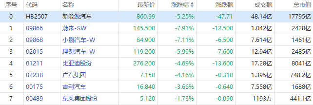 华盛资讯8月10日消息,港股新能源汽车股持续下挫,蔚来跌7.91%,报145.5港元每股,成交额1.04亿港元;小鹏汽车跌超7%,理想汽车跌近6%,长城汽车、比亚迪股份跌超4%,吉利汽车跌超3.66%,东风集团跟跌。