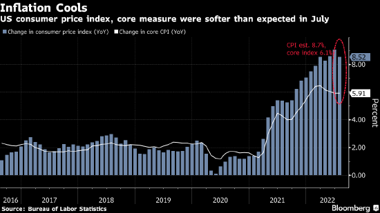 美国劳工部周三的数据显示,7月份消费者价格指数(CPI)环比持平,同比增长8.5%,低于6月创下的9.1%这个四十年来最大增幅。
