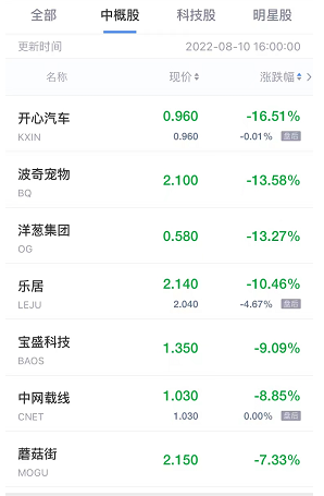 开心汽车跌超16%,洋葱集团跌超13%,蘑菇街跌超7%,叮咚买菜跌超5%,京东跌超2%、荔枝、趣活、第一高中教育,汽车之家、搜狐跌超1%。