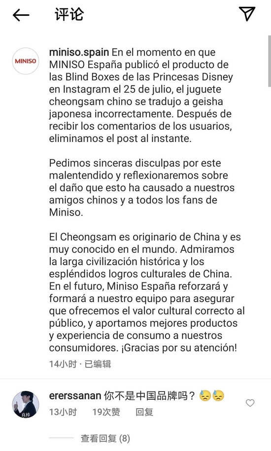 8月9日晚,名创优品官方微博发布了一则致歉声明。在致歉声明中,名创优品表示,7月25日西班牙名创优品在其Instagram账号上把发布了一则“公主系列公仔盲盒”帖文,并将中国旗袍公仔错误地翻译成了“日本艺妓”。