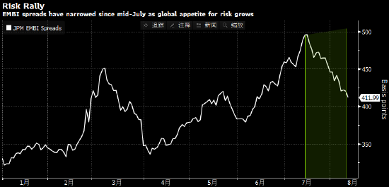 美国最新的通胀数据促使投资者缩减了对美联储收紧政策的押注,引发了一波风险资产的上涨。新兴市场主权债相对于美国国债的利差周三收窄,延续了自7月中旬摩根大通指数利差触及两年多最高水平之后的走势。