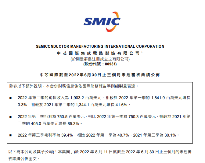中芯国际在港交所公告,2022年第二季的销售收入为19.03亿美元,相较于2022年第一季的18.42亿美元增长3.3%,相较于2021年第二季的13.44亿美元增长41.6%。