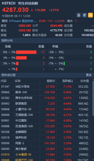 恒生科技指数涨2.71%,华虹半导体涨7.13%,百度涨3.92%,小米涨2.95%,阿里涨2.9%。