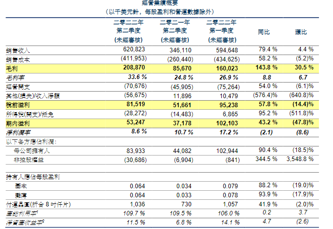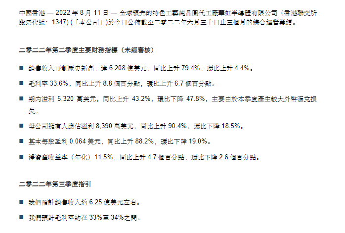 港股华虹半导体中午发布公告,二季度销售收入再创历史新高,达6.208亿美元,同比上升79.4%,环比上升4.4%。净利润录得8390万美元,同比上升90.4%,环比下降18.5%。预计三季度销售收入约6.25亿美元左右,毛利率约在33%至34%之间。