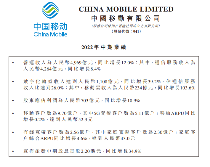 中国移动宣布派发中期股息每股2.20港元,同比增长34.9%;2023年以现金方式分配的利润逐步提升至当年公司股东应占利润的70%以上。