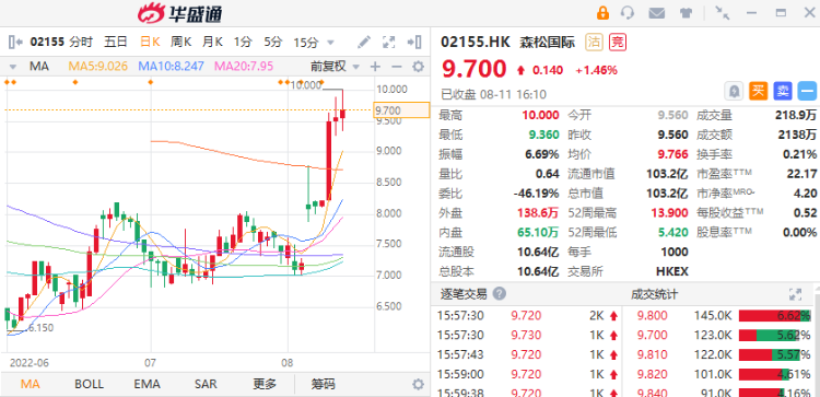 - 浙商证券研报表示,维持森松国际“增持”评级,综合考虑其充沛的在手订单、跨行业布局的产品基础,看好公司在2022-24年的成长能力。从增长持续性看,2022-24年制药、动力电池材料、电子化学品等领域有望受益于下游加速增长的资本开支,收入端复合增速有望达到30%左右。从能力角度看,在多行业压力装备领域的客户基础、持续增长的在手订单从侧面验证了其在工艺设计、高端制造、数据运维、模块化工厂领域的竞争优势。