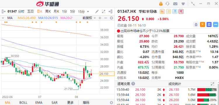 4、华虹半导体二季度销售收入再创历史新高,达6.208亿美元,净利同比上升90.4%。高盛维持其“确信买入”评级 目标价47港元。