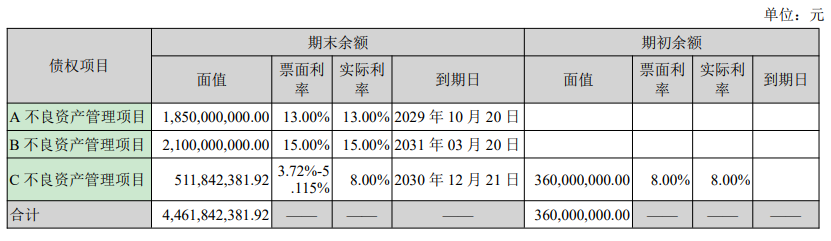 我们以规模最大的债权投资类资产为例,其主要有A、B、C三个不良资产管理项目组成,从利率水平来看,都是高风险高收益债权资产,且到期日分别为2029、2031、2030年。从利率水平、相关年限和海德布局的行业类别看,去年新增的该3个项目大概率是房地产项目,且可能是房企刚发行不久就暴雷的债务。