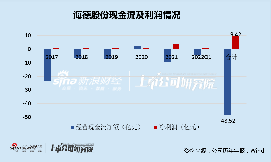 自2017年以来,海德股份的经营现金流净额6年中有5年为净流出,截止今年Q1合计净流出48.52亿元,而同期的净流润仅有9.42亿元。远低于全国性AMC资产重组类业务百分之十几左右的回报水平。