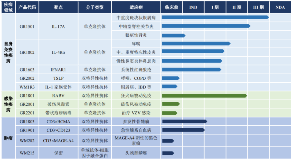值得注意的是,GR1501为国内企业首家进入 III 期临床试验的抗IL-17单克隆抗体,GR1603为国内企业首家进入I期临床试验的抗IFNAR1单克隆抗体,GR1801是国内首家进入临床的抗狂犬病病毒G蛋白双特异性抗体。