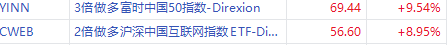 ETF方面,3倍做多富时中国50指数 $YINN 涨超9%,2倍做多沪深互联网指数 $CWEB 涨超8%,中国海外互联网ETF $KWEB 涨超4%。