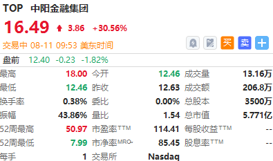 次新股中阳金融 $TOP 直线拉升,现涨超30%,盘中一度触发熔断。中阳金融是一家总部位于香港的在线经纪商,主要通过两家子公司中阳证券和中阳资本,从事本地和国外股票、期货和期权产品交易业务。