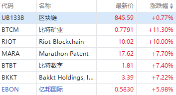 区块链概念股集体拉升,比特矿业涨超11%,Riot涨超10%,Marathon Digital、比特数字涨超7%,亿邦国际涨超5%。