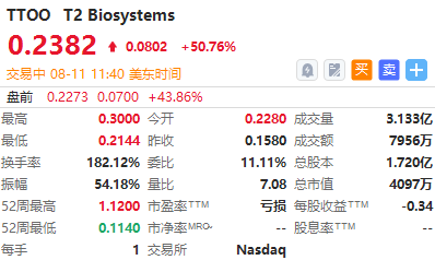 猴痘概念股T2 Biosystems盘中涨超50%,该公司周二表示正在研究开发一种快速分子诊断测试来检测猴痘病毒的计划。此外,据美国疾控中心10日公布的数据,美国猴痘确诊病例超1万例。