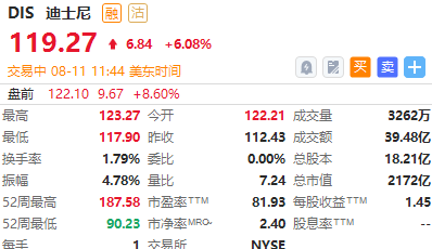 迪士尼 $DIS 盘中涨超6%,公司Q3营收为215亿美元,同比增长26%,超出市场预期;三季度Disney+订阅用户同比增长31%至1.52亿,远超市场预期。