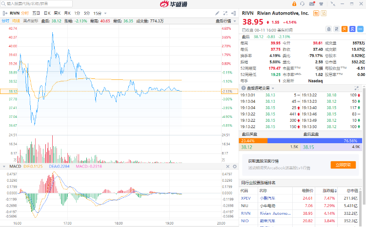 当日,Rivian股价在纳斯达克常规交易中上涨1.55美元,报收于38.95美元。在随后盘后交易中,Rivian股价下跌至38.12美元,跌幅为2.13%,一度跌超5%。过去52周,Rivian的最高价为179.47美元,最低价为19.25美元。