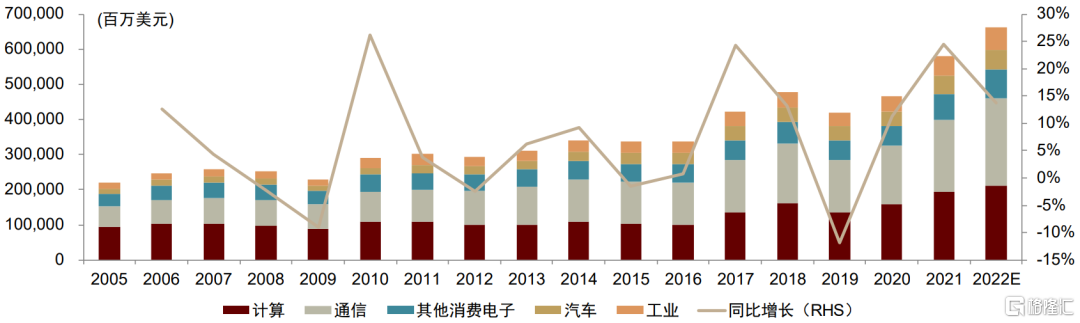 图表:2005-2022E全球半导体销售额按下游应用拆分