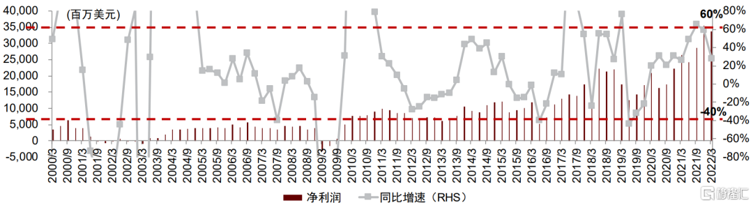 我们将费城半导体指数的增长动力拆分为业绩和估值两部分。我们看到费城半导体指数在上行周期发生“戴维斯双击”,在下行周期发生“戴维斯双杀”,且整体呈现“牛长熊短”的局面。另外,在2010年后的历次周期中费城半导体指数30家成分股净利润(季度)之和同比增长主要在-40%至60%之间波动(也有少数几个季度超出这个范围),费城半导体指数PE(TTM)则在15x至35x之间波动。