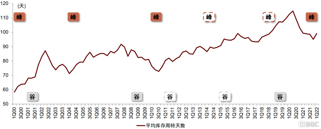 图表:1Q00-1Q22全球主要芯片商库存周转天数