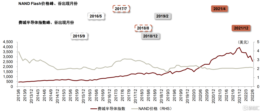 我们以月度为单位,比较费城半导体指数峰、谷出现时间和NAND Flash价格的峰、谷出现时间的关系。我们发现2014、2018、2021年费城半导体指数的峰值出现时间滞后于NAND Flash价格6-12个月,2015、2019年费城半导体指数的谷值出现时间领先于NAND Flash价格3-9个月。