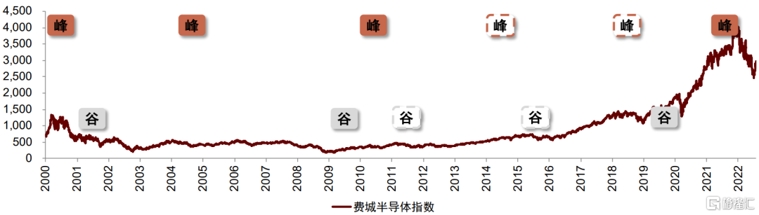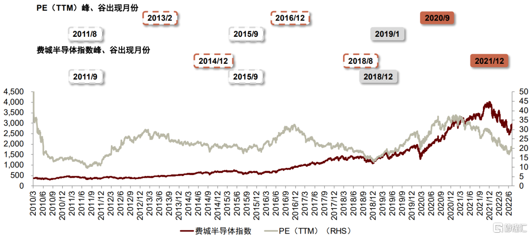 我们以月度为单位,比较费城半导体指数峰、谷出现时间和PE(TTM)出现时间的关系。我们发现,2014、2017、2021年的三次半导体周期高峰费城半导体指数峰值出现时间滞后于PE(TTM)15-24个月,2011、2015、2019年的三次半导体周期低谷费城半导体指数谷值出现时间和PE(TTM)基本同步。
