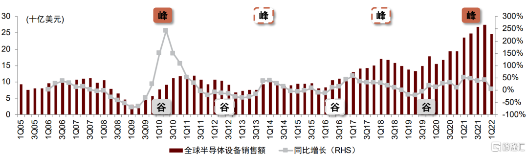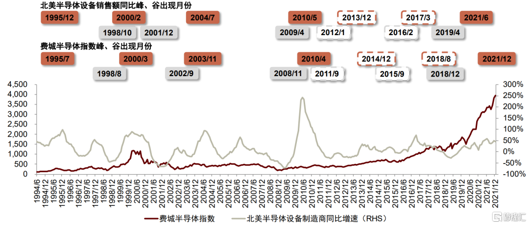 我们以月度为单位,比较费城半导体指数峰、谷出现时间和北美半导体设备制造商同比增速的峰、谷出现时间的关系。我们发现2014、2018、2021年费城半导体指数的峰值滞后于北美半导体设备制造商同比增速6-15个月,2015、2019年费城半导体指数的峰值领先于北美半导体设备制造商同比增速3-9个月。