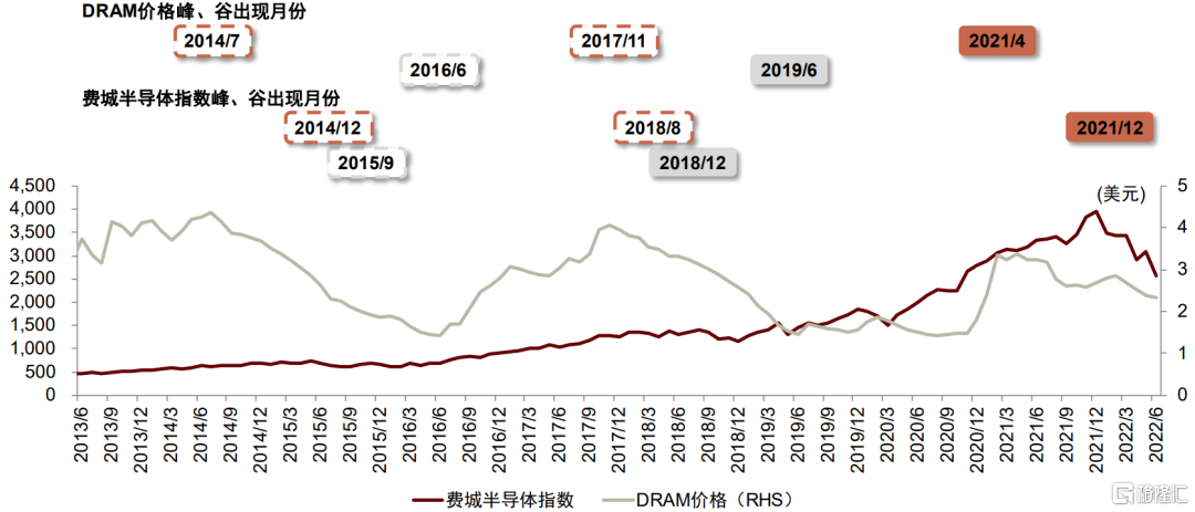 我们以月度为单位,比较费城半导体指数峰、谷出现时间和DRAM价格的峰、谷出现时间的关系。我们发现2014、2018、2021年费城半导体指数的峰值出现时间滞后于DRAM价格6-9个月,2015、2019年费城半导体指数的谷值出现时间领先于DRAM价格6-9个月。