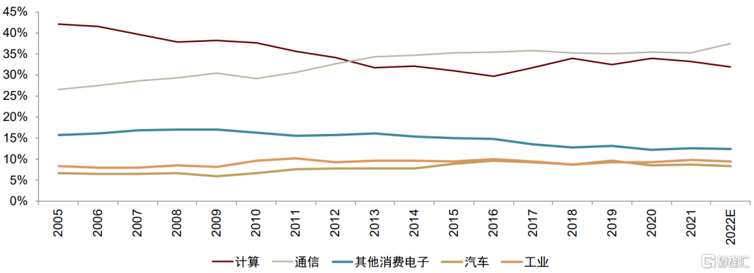图表:2005-2022E全球半导体销售额各下游应用占比