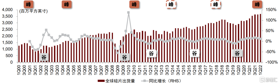 半导体上行周期中,晶圆厂需求增加后需要向硅片厂增加采购硅片,硅片出货量增加,而在下行周期中,晶圆厂会减少硅片的采购。以2015-2019年这轮完整周期(谷-峰-谷)为例,4Q15是硅片出货量的低谷,出货量25亿平方英寸,同比增速为-1.8%。2Q16开始硅片同比增速转正,同比增速在1Q17达到最大值12.6%。硅片出货量绝对值在3Q18到达顶峰33亿平方英寸。同比增速于1Q19转为负数,绝对值在4Q19到达低谷28亿平方英寸。