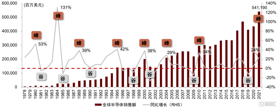 根据WSTS测算,2021年全球半导体销售额同比增长24%至5,412亿美元,达到历史新高度。1978年以来,全球半导体产业共经历了7轮大周期,目前正处于第8轮大周期,8个峰分别出现在:1980年前后、1984年前后、1988年前后、1995年前后、2000年前后、2004年前后、2010年前后、2021年前后(按照同比增速或绝对规模判断,有时两者同步,有时相差1年),7个谷分别出现在:1981年前后、1985年前后、1990年前后、1998年前后、2001年前后、2009年前后、2019年前后(按照同比增速或绝对规模判断,有时两者同步,有时相差1年)。