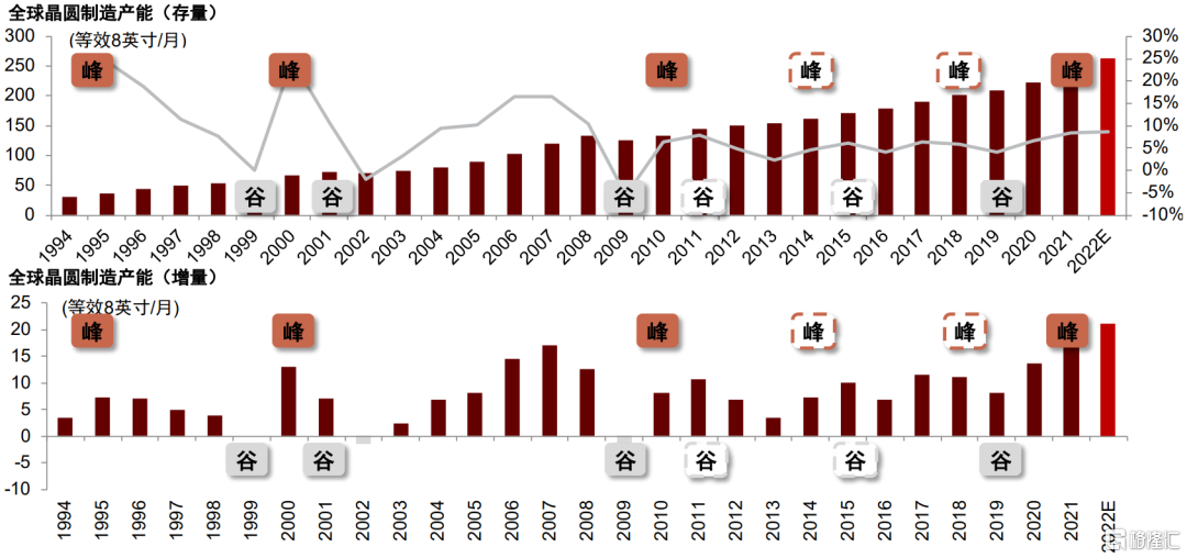 2002年、2009年产能发生了“负增长”,我们认为属于极端情况,主要是“互联网泡沫”、全球金融危机造成的系统性危机使得部分晶圆厂从市场退出或被出售。