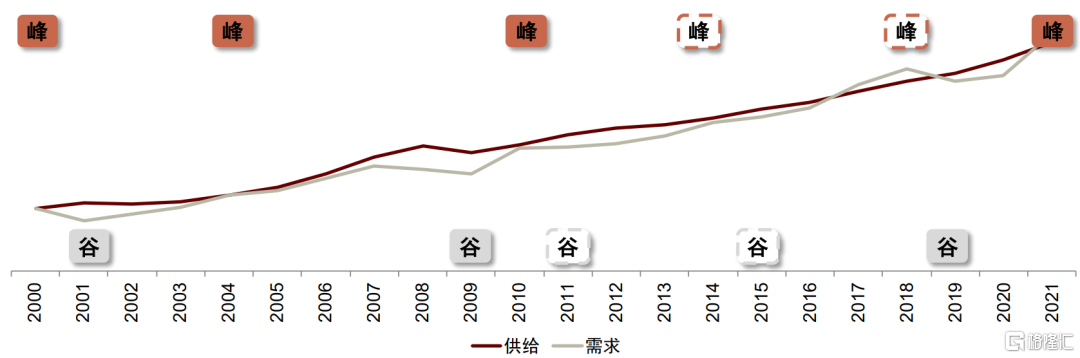 2009年供给侧的减少使得全球需求于2010年恢复时,供小于求,出现峰。2011年欧债危机使得需求有一定下滑,同时由于该年供给的集中释放,供大于求,出现谷。