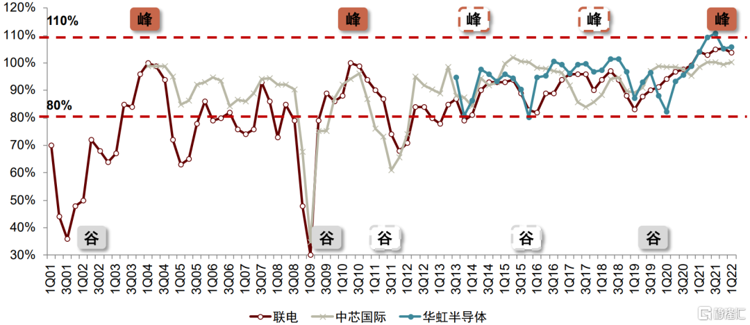 图表:1Q01-1Q22联电、中芯国际、华虹半导体产能利用率