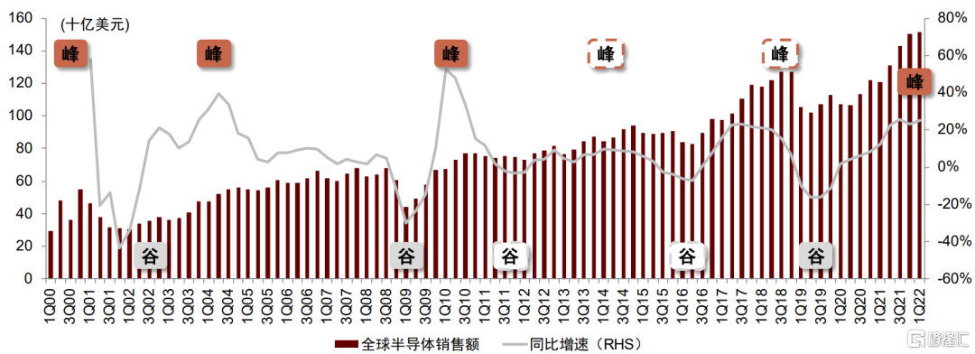 图表:1Q00-1Q22全球半导体销售额(季度)