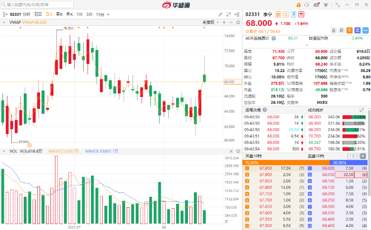 华盛资讯8月12日消息,港股李宁高开拉升,盘初涨近7%;现涨1.64%,报68港元每股,成交额4.28亿港元;消息面上,李宁中期营收同比上升21.7%至124.09亿元。