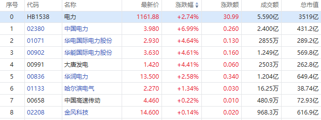 华盛资讯8月12日资讯,今日电力股强势上扬,截至发稿,中国电力涨6.99%,报3.98港元每股,成交额2.4亿港元;华电国际电力股份涨4.64%,华能国际电力股份涨4.61%,大唐发电涨超4%,华润电力、哈尔滨电气跟涨。