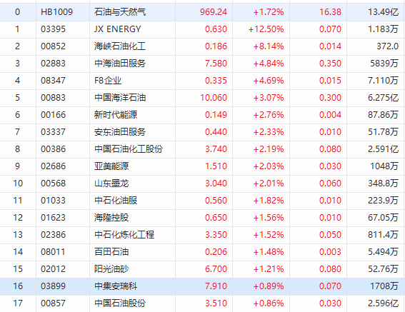 华盛资讯8月12日消息,国际油价周四显著上涨,港股油气板块今日冲高,截至发稿,中海油田服务涨近5%,中国海洋石油涨超3%,中国石油化工涨2.19%,中国石油股份涨近1%。