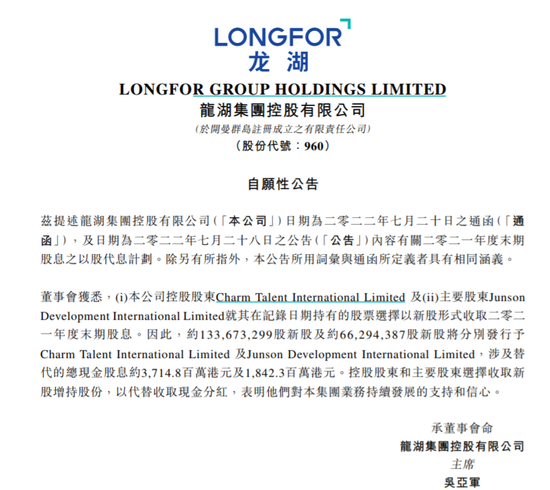 根据公告,公司控股股东Charm Talent International Limited 及主要股东Junson Development International Limited就其在记录日期持有的股票选择以新股形式收取2021年度末期股息。