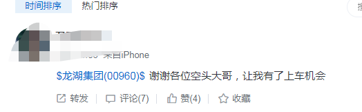 在龙湖下跌之际,很多股民相继加仓,有股民就表示,“谢谢各位空头大哥,让我有了上车机会”,“早上又买了一点”