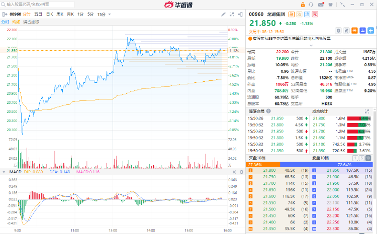 值得注意的是,很快龙湖股价拉升,截至目前已逼近翻红,报价21.85港元,如果股民抄底可能短线赚了不少钱。