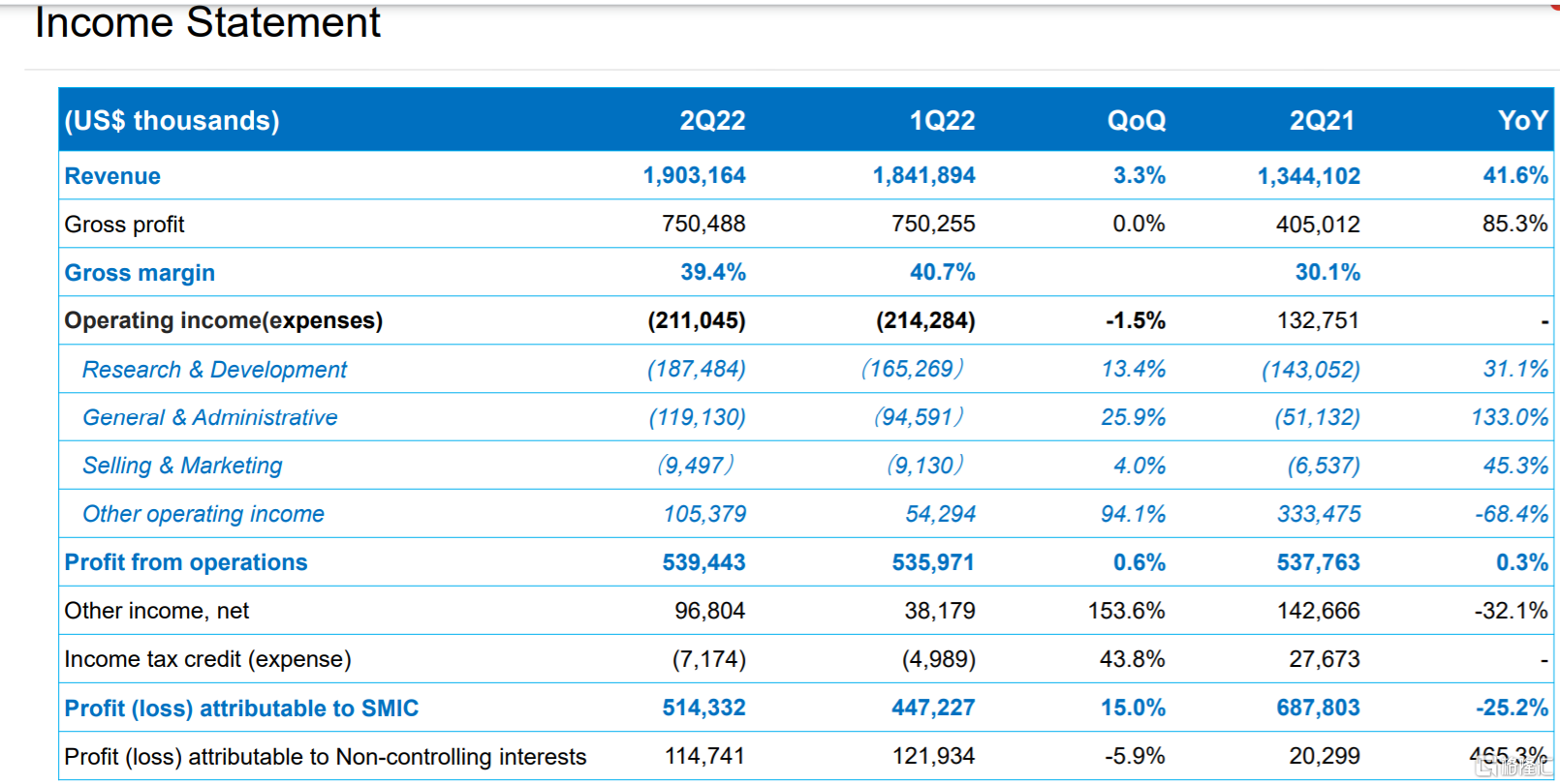 今年二季度公司销售收入突破19亿美元,环比增长33.3%,出货量以及销售单价均有小幅增长。产能利用率为97.1%,,毛利率为 39.4%。我们在5月的业绩会上预期疫情对二季度生产的影响在5个百分点左右,实际上由于疫情对于人员流动的管控,部分工厂岁修并没有在二季度进行,使疫情对于产出的整体影响低于预期,因而当季收入和毛利率都略超指引。