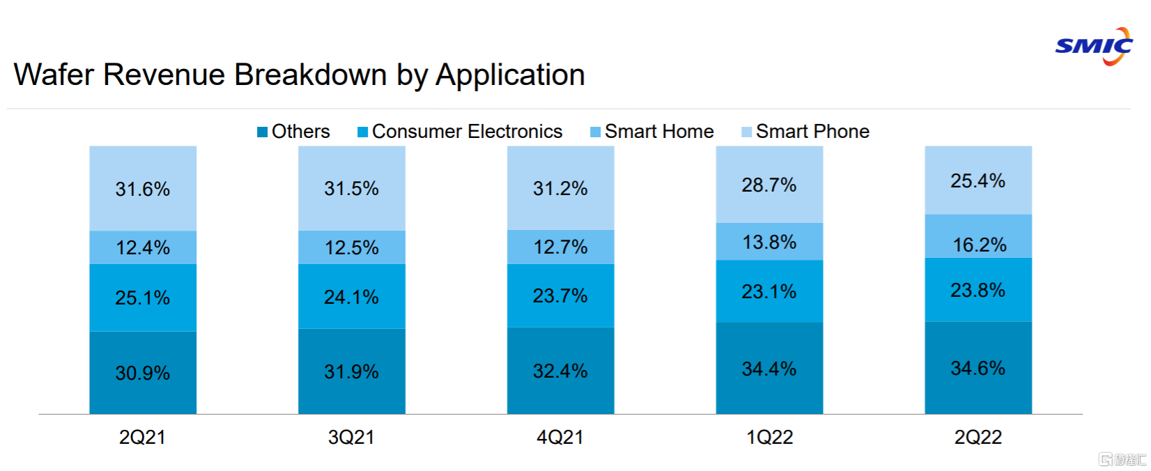 按应用分类,中芯国际Q2收入中智能手机的占比为25.4%,智能家居的占比为16.2%,消费电子的的占比为23.8%,齐其他的占比是35%,其中智能家居环比增长24%,消费电子在高端模拟,MCU平台需求增量带动下,环比增长8%,其他应用中的工业类环比增长18%。应用分类中只有智能手机因去库存,收入环比下降7%