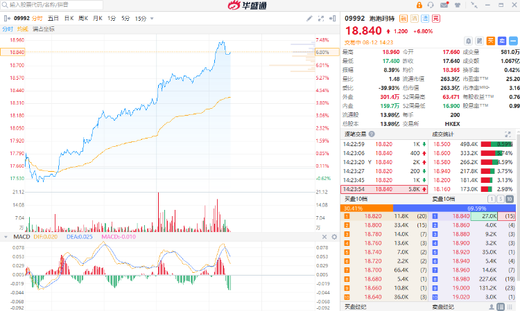 华盛资讯8月12日消息,泡泡玛特全天强势走高,最新报18.84港元每股,涨6.8%,成交额1.06亿港元。