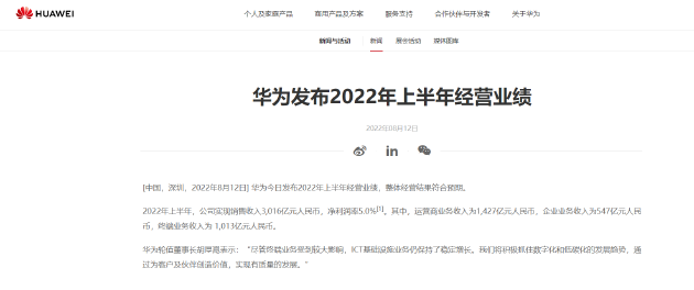 数据显示,2022年上半年,华为实现销售收入3016亿元人民币,净利润率5.0%。其中,运营商业务收入为1427亿元人民币,企业业务收入为547亿元人民币,终端业务收入为 1013亿元人民币。