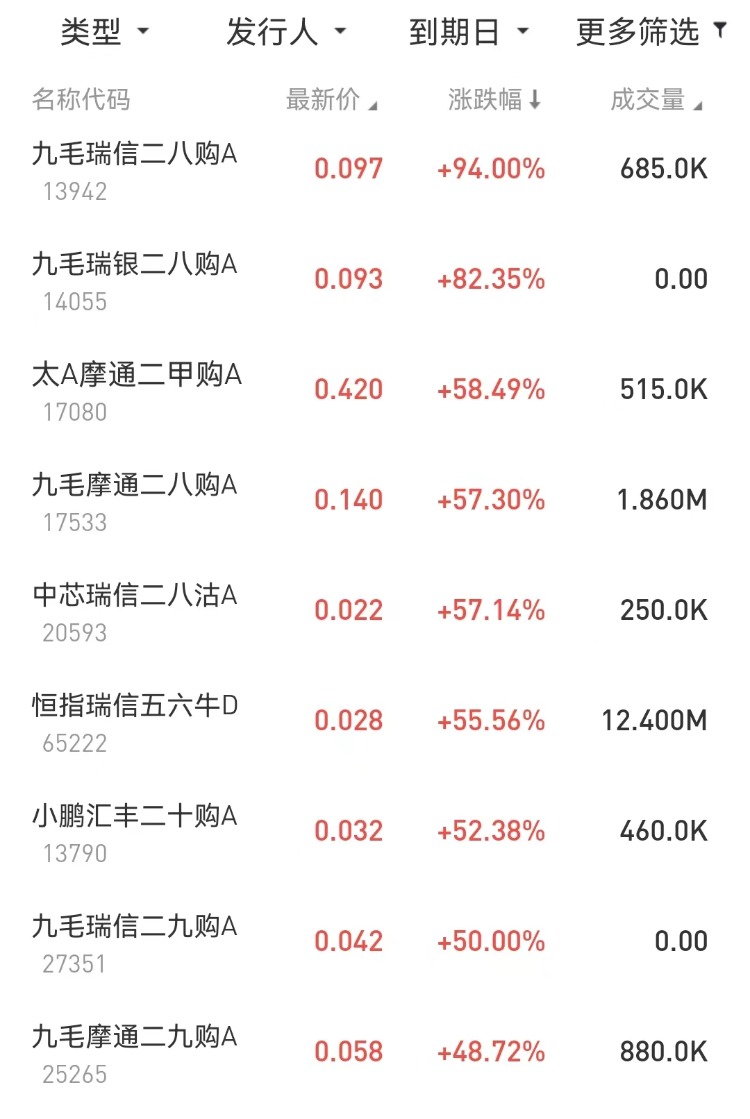 在今日涨幅榜中,九毛瑞信二八购A $13942.HK 涨94.00%;中芯瑞信二八沽A $20593.HK 涨57.14%,恒指瑞信五六牛D $65222.HK 涨55.56%。
