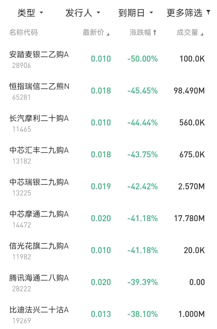 在今日跌幅榜中,安踏麦银二乙购A $28906.HK 跌50.00%;恒指瑞信二乙熊N $65281.HK 跌45.45%。