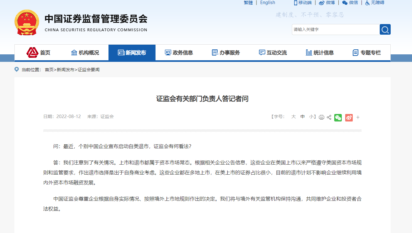 证监会:我们注意到了有关情况。上市和退市都属于资本市场常态。根据相关企业公告信息,这些企业在美国上市以来严格遵守美国资本市场规则和监管要求,作出退市选择是出于自身商业考虑。这些企业都在多地上市,在美上市的证券占比很小,目前的退市计划不影响企业继续利用境内外资本市场融资发展。