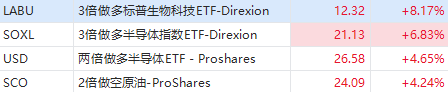 ETF方面,3倍做多标普生物科技ETF-Direxion $LABU 涨超8%,3倍做多半导体指数ETF-Direxion $SOXL 涨超6%,2倍做空原油-ProShares $SCO 涨超4%。