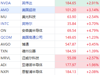 美股半导体板块走高,安森美半导体涨超4%,美股超微涨超3%,恩智浦半导体、英伟达、美光科技涨超2%。