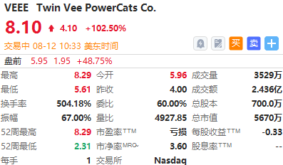 电动船及休闲双体船制造商Twin Vee PowerCats Co. $VEEE 盘初暴涨超102%,公司2022年第二季度报告的销售额为852万美元,比去年同期的330万美元的销售额增加了158.34%。